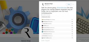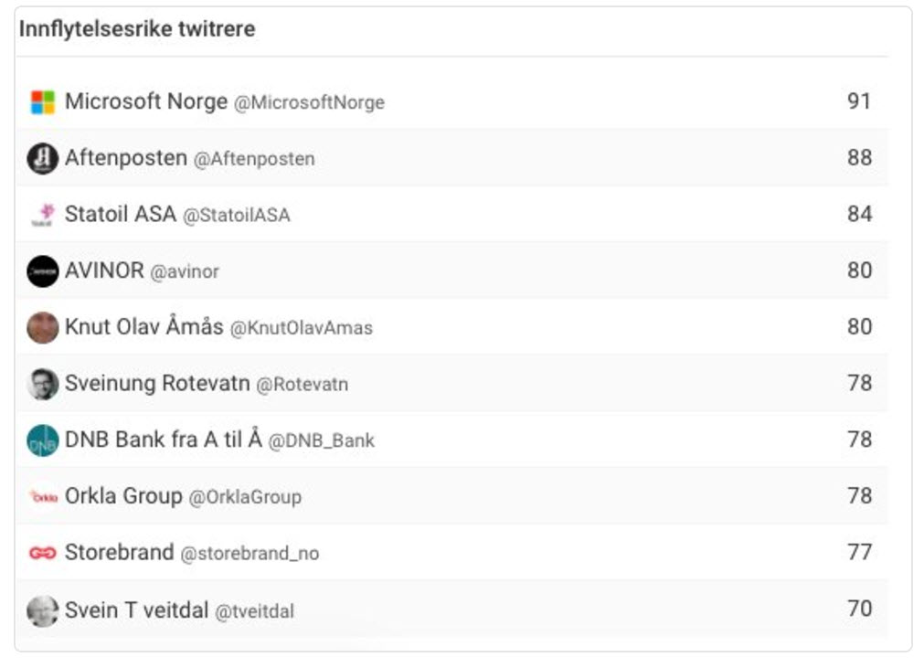 Posted on August 24, 2017August 24, 2017 by Klima 2020 Mest innflytelsesrike twitrere under Arendalsuka 2017 @Tveital ligger på topp 10 lista. Beregnet av retriever etter Klout score 19.August 2017. Share this...FacebookPinterestTwitterLinkedin